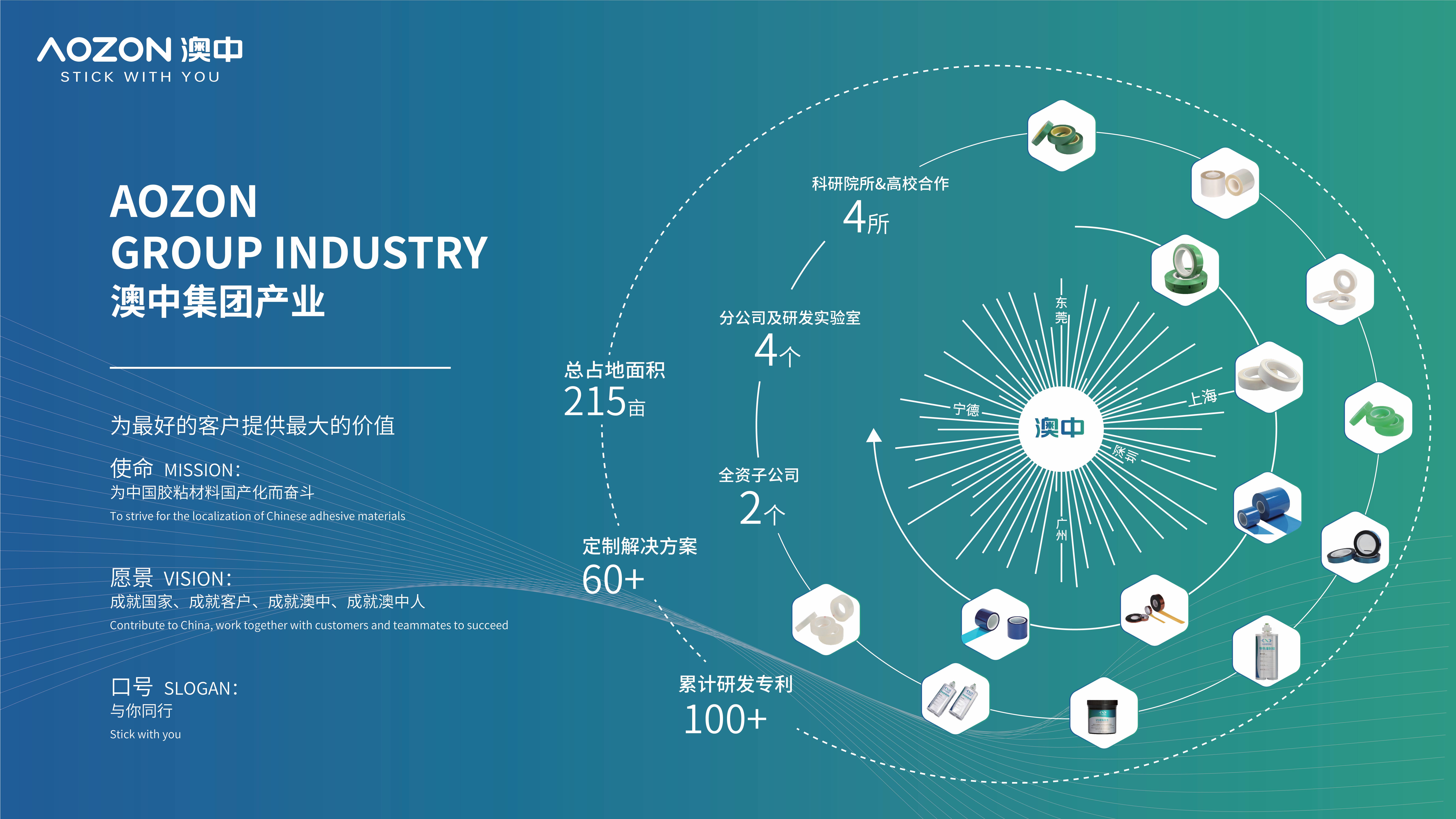 澳中集团自成立以来,始终坚持创新驱动发展的长期战略,专注于特种胶粘剂、胶粘带产品研发、生产和销售,为客户量身定制了多个胶粘解决方案并开发了一系列特种胶粘剂、胶粘带产品;是当前中国消费电子、新能源汽车光电显示等行业胶粘剂和新材料重要供应商之一。